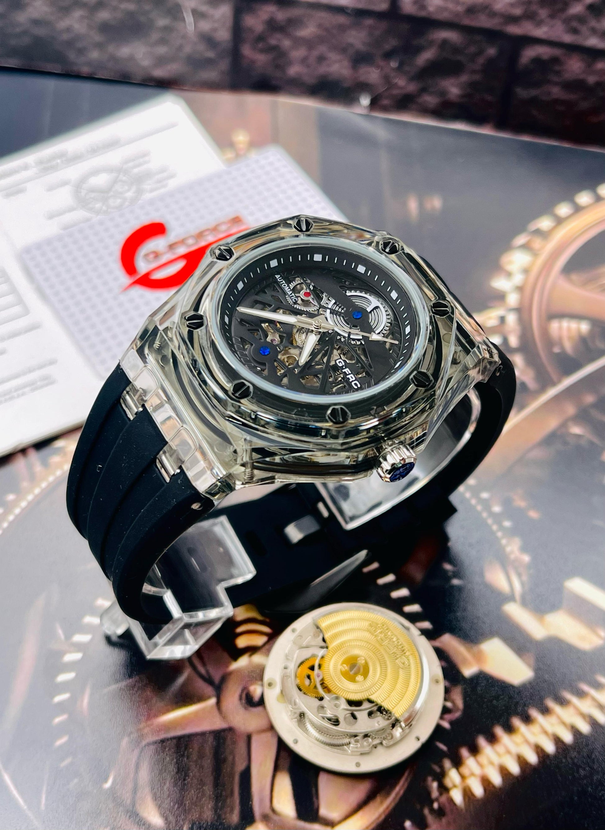 Cuenta con maquinaria automática que se activa con el movimiento, ofreciendo una experiencia auténtica y funcional. La pulsera de silicona brinda comodidad durante todo el día, mientras que su cristal mineral con tapa invisible resalta el diseño interno del reloj, aportando un toque sofisticado y actual.